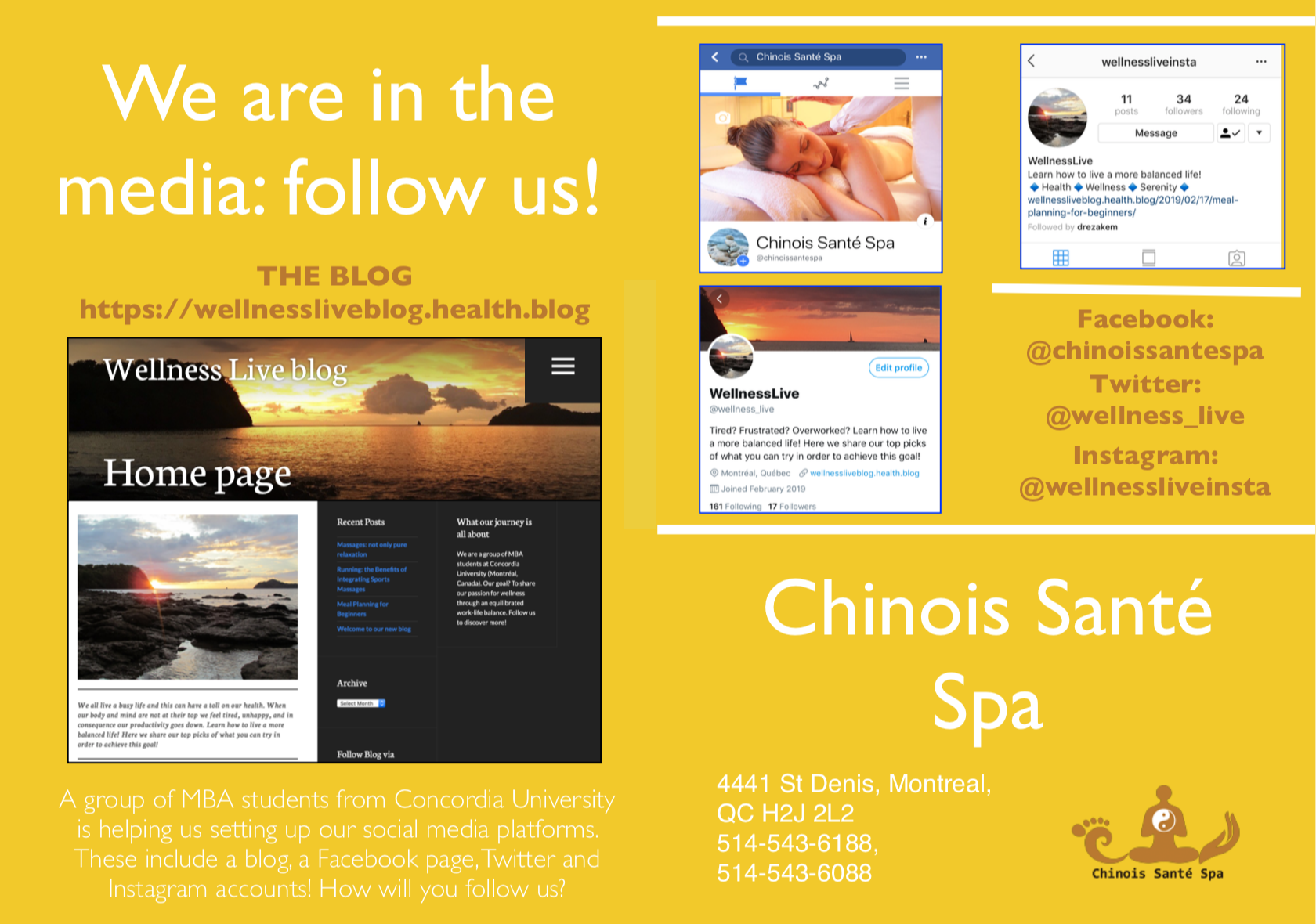 While by now you know everything about the blog, you might have not realized that this project was very linked to our consulting assignment. In fact, the client that we decided to help is Sabrina, a Chinese massage therapist in need of a social media strategy for her Chinois Santé Spain Montréal. This was a very challenging, yet exciting assignment for us, and it gave us the opportunity not only to develop a strategy and some ad-hoc recommendations for Sabrina, but also to set up a series of social media tools that she will be able to use in the future to keep her customers happy and interested.
